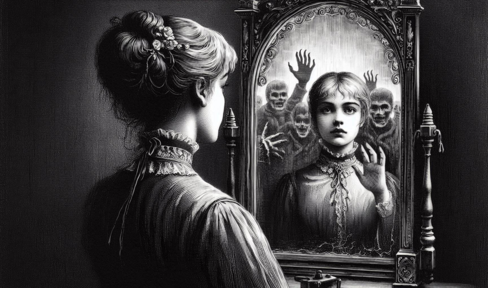Transfixed by the unfolding violence, Amanda failed to notice the change in her surroundings. The room had grown colder, shadows deepening in the corners. When she finally tore her gaze from the mirror, she found herself no longer alone. Ghostly figures filled the space, their forms flickering like candlelight. Each bore the marks of their violent ends - bruises, cuts, and worse. Their hollow eyes fixed on Amanda with a hunger that chilled her to her core.