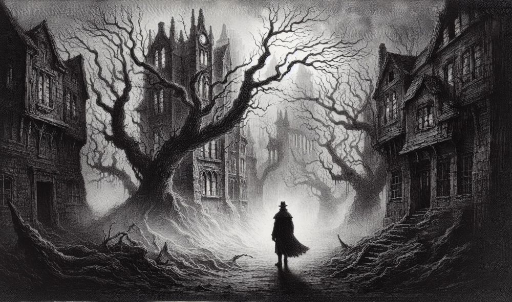 A rustling sound from behind made Jane whirl around. She found herself face to face with a figure that defied comprehension. It wore the tattered remains of a 1950s suit, but its skin was a sickly gray, pulled tight over elongated limbs. Its face was a nightmare of distorted features, with bulging eyes and a mouth that split its head nearly in two.